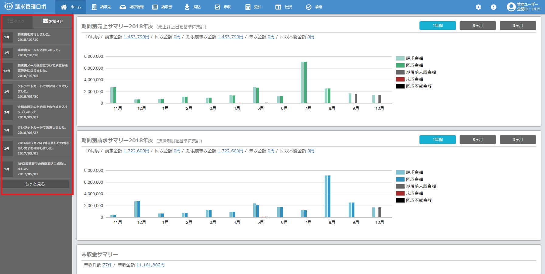 請求管理ロボのホーム画面にて表示される「お知らせ」では、クレジットカード決済や口座振替の成功や失敗、請求書自動送付の送付結果等、各結果の通知が行われます。