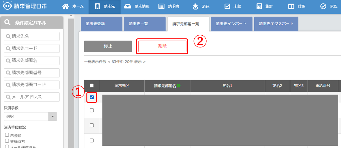 請求先部署削除は、請求先 → 請求先部署一覧で削除可能です。