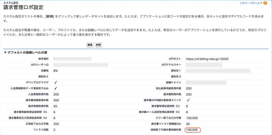 設定画面から「カスタム設定」を表示し、「強制終了の請求書明細件数」を設定する。