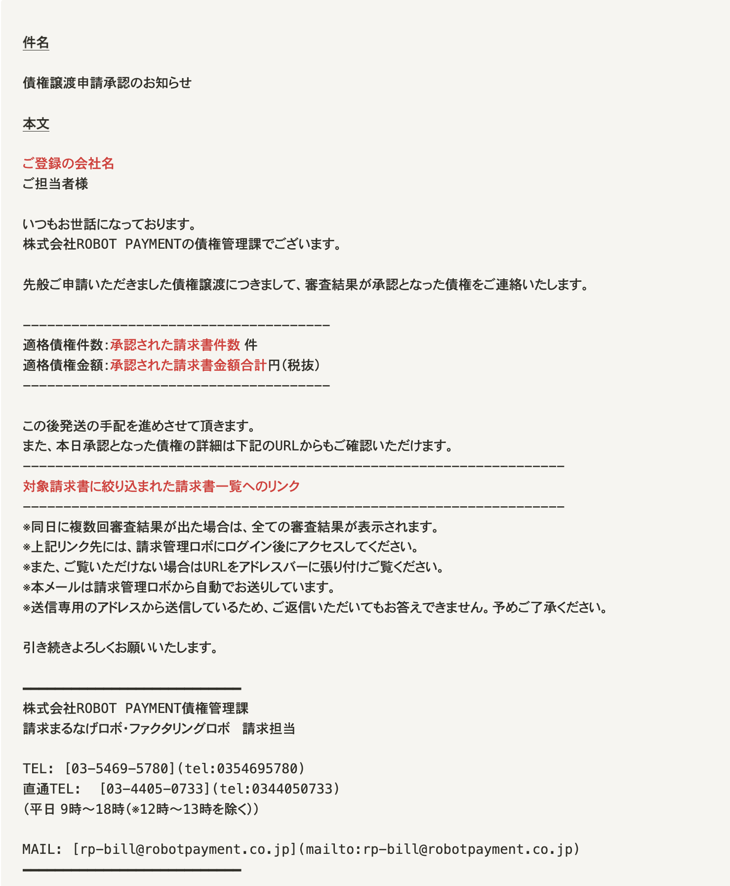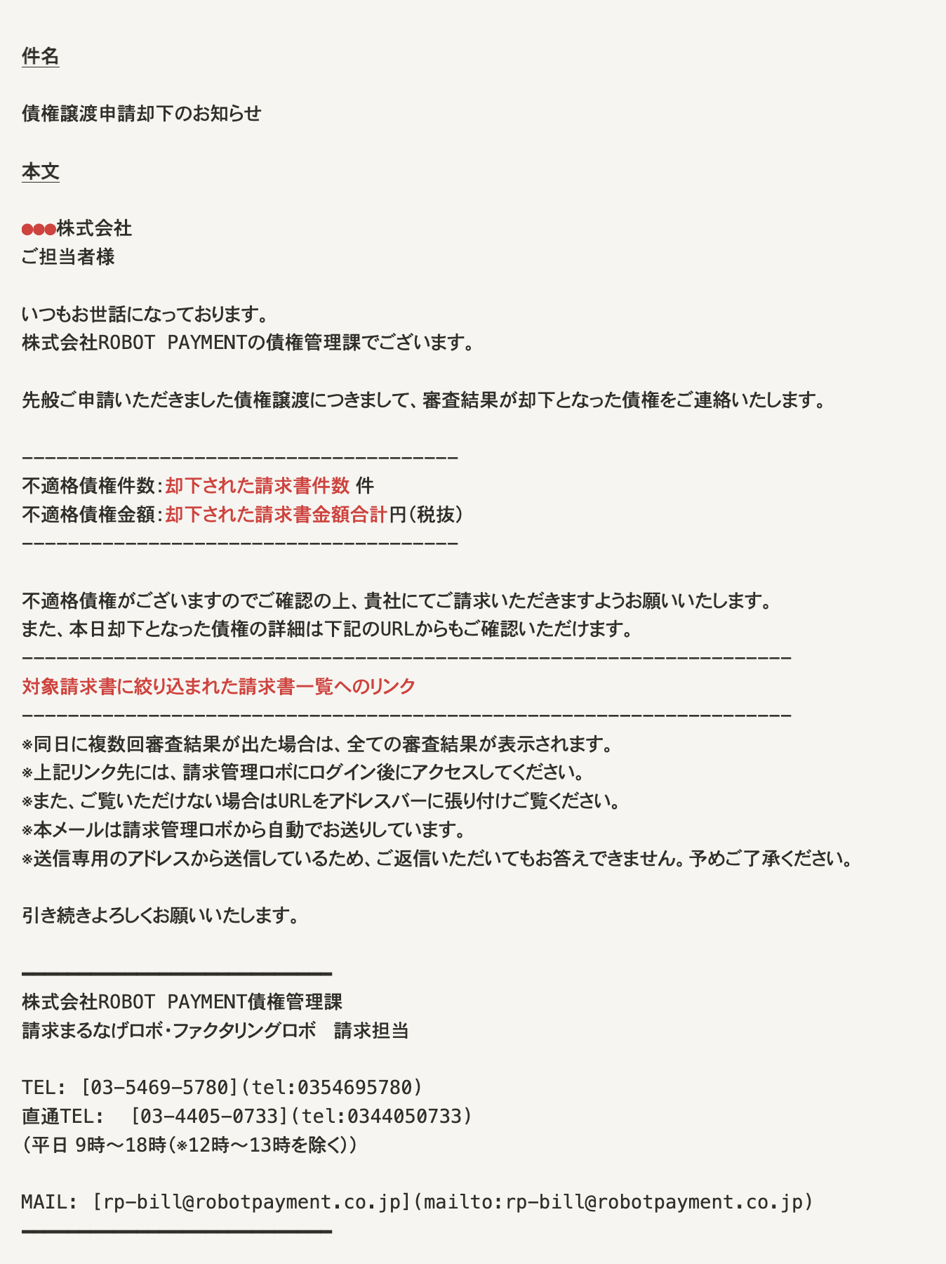 却下された債権に関しては貴社にてご請求をいただく必要がございますので、却下通知に関しては債権譲渡に携わる担当者様は原則ONにしておくことを推奨致します。