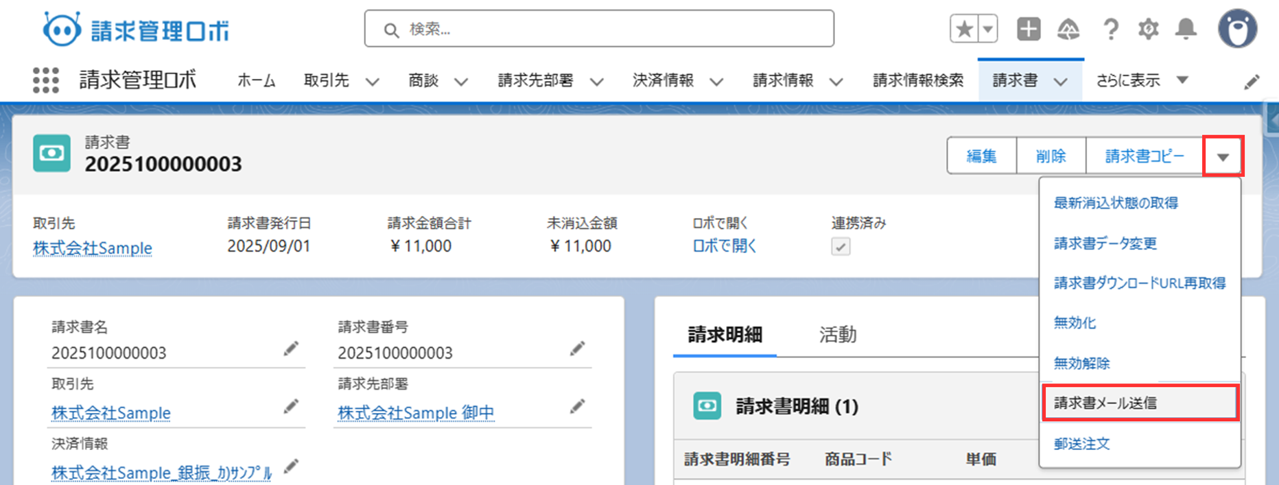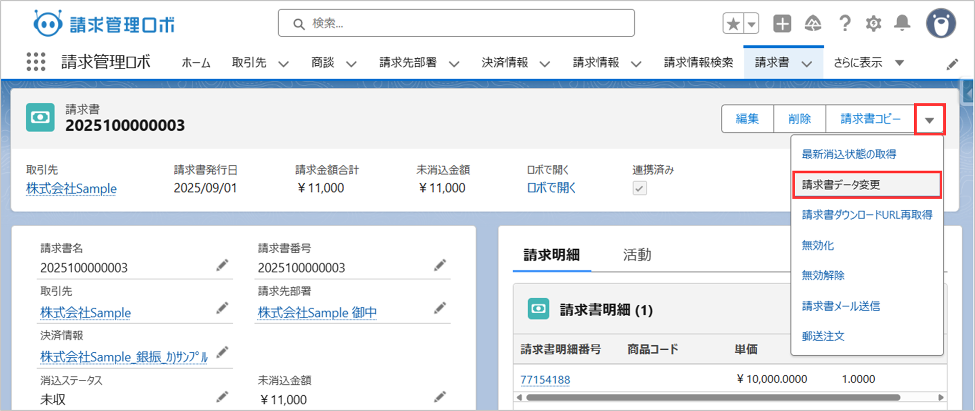Salesforce側の「請求書送付予定日」「決済期限」「通信欄」のいずれかの項目値を変更した場合、以下の操作で請求管理ロボ側に反映されます。