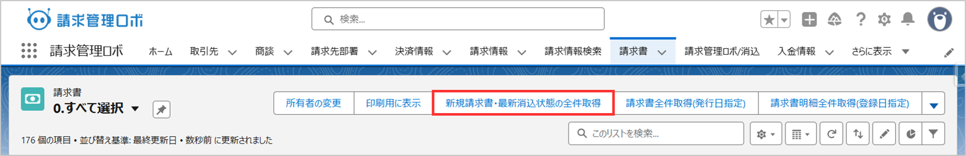 ・操作手順(手動反映): Salesforce側の「請求書」リストビュー画面上の[新規請求書・最新消込状態の全件取得]ボタンを押下します。