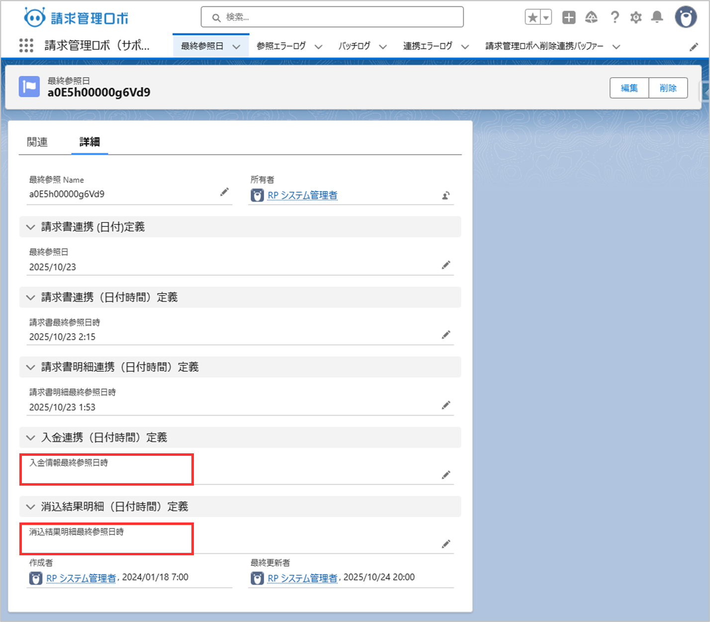 2. レコードが存在する場合、詳細画面を開き、「入金情報最終参照日時」および「消込結果明細最終参照日時」の項目に値が設定されているか確認してください。