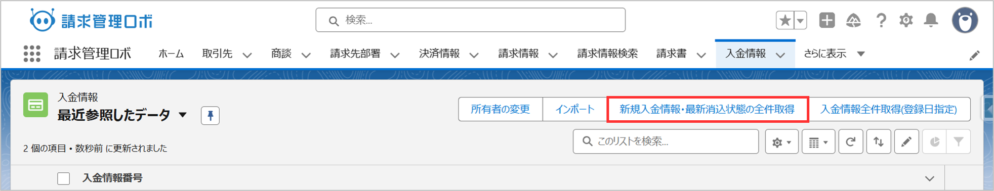 2. リストビュー上部にある「新規入金情報・最新消込状態の全体取得」ボタンをクリックして、バッチを手動で実行します。